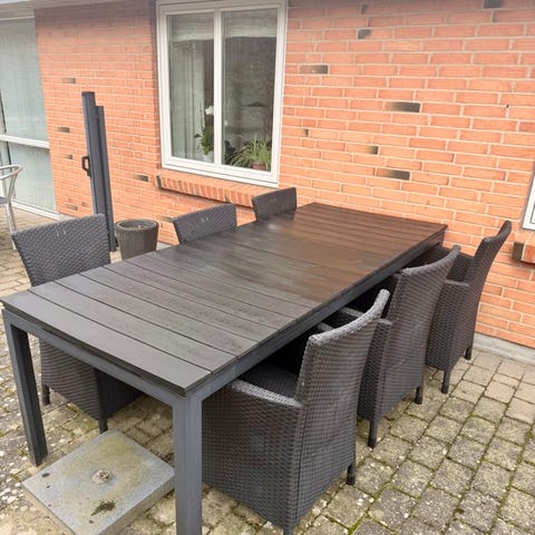 Købt i Jem og Fix for 10 år siden, men i rigtig god stand - fejler ikke noget udover alderen. Havanna bord i sort aluminium og nonwood (90 x 90 cm) og 4 sorte stole i rattan. Minder om Sunlife, men med højere ryglæn. Bordet står til 449 i nypris. Sælges samlet - grundet flytning.