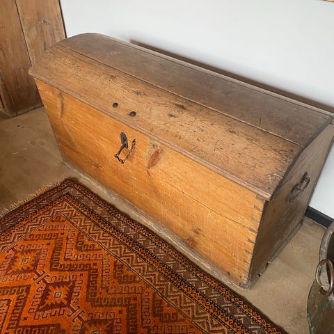 Træ kiste med bueformet låg og metalbeslag. Kisten er udført i massivt træ med synlige årer og patina. Den har et dekorativt metalbeslag til lukning på fronten samt metalhåndtag i siderne til at løfte kisten. Indvendigt er der et stort opbevaringsrum samt et mindre rum i den ene side. Velegnet til opbevaring af f.eks. tekstiler, legetøj eller andre genstande, eller som møbel i entre, stue eller soveværelse.