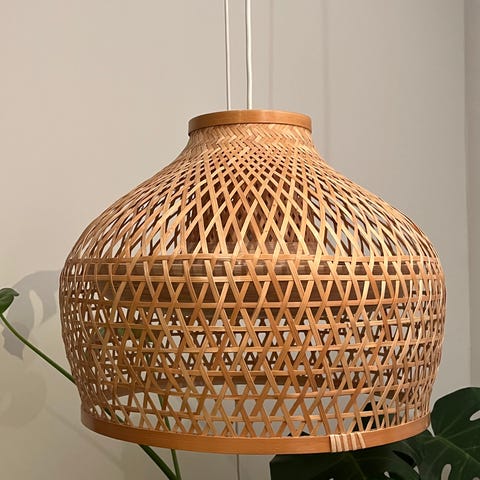 Lampeskærmen er håndmalet og kan forskydes ved hjælp af to træ skinner.