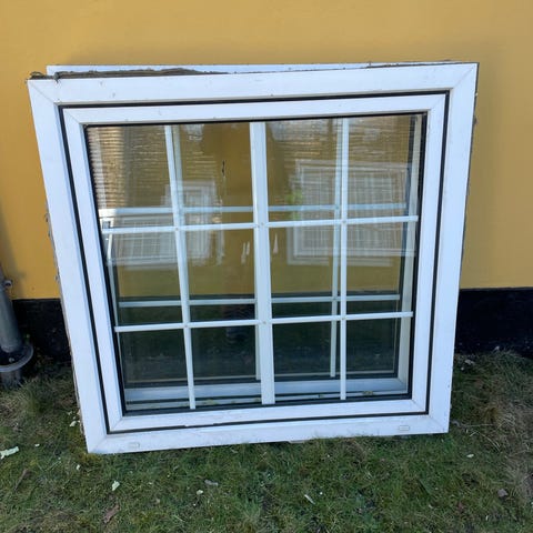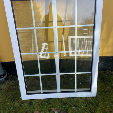 Vindue med sprosser i hvid ramme. Vinduesrammen er oplukkelig med greb i siden.