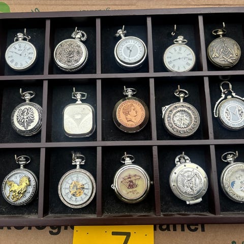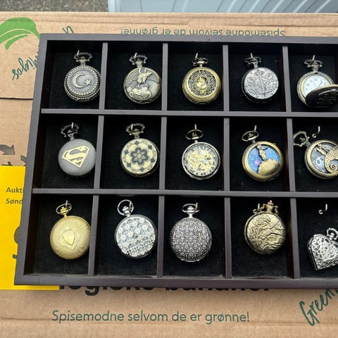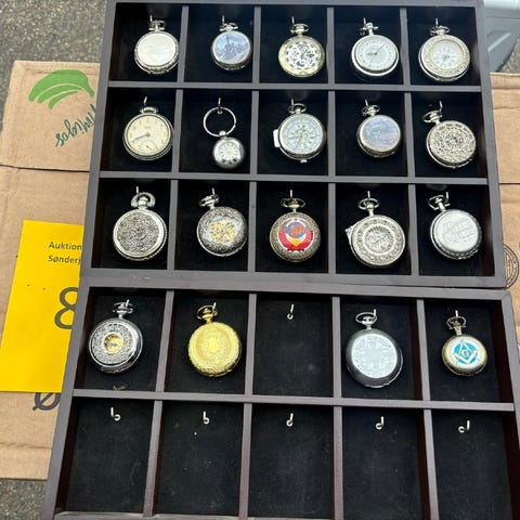 Samling af 15 lommeure i displaykasse. Forskellige modeller og motiver. Brugt med brugsspor. Fra dødsbo.