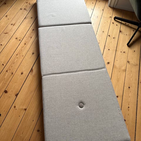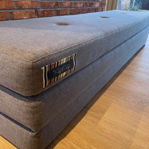 Foldemadras fra by KlipKlap. Kan bruges som lav sofa, stor dobbeltmadras (150x180cm) eller tumlemadras. Brugt meget sparsomt, fremstår i rigtig fin stand. Fra ikke-ryger/dyrefrit hjem. Skal afhentes i Ørestad.