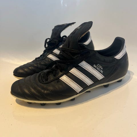Adidas Copa Mundial fodboldstøvler i sort læder med hvide striber. Klassisk model med snørelukning og fast sål med runde knopper, egnet til brug på græsbaner. Overdel i glat læder, polstret hælkappe og inderside for øget komfort. Velegnet som fodboldstøvler til udendørs spil.