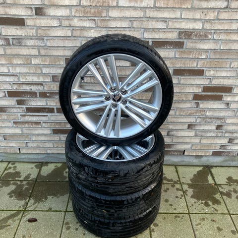 Skoda fælge med dæk. Sættet består af komplette hjul med alufælge monteret med vinterdæk. Fælgene er originale Skoda-fælge med fler-eget design i sølvfarve. Dækkene er monteret og klar til brug på bilen. Velegnet som komplet hjulsæt til en Skoda personbil, som vist på billederne. For 235/55 R19, M+S. Bag 255/50 R19 M+S. Fejlfri og kørt under 5.000 km.