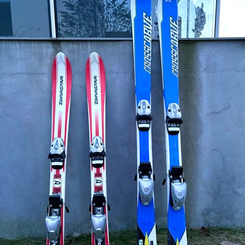 Crosscarve alpinski med tilhørende stave. Skiene er i en blå farve med bindinger monteret. Sættet egner sig til alpint skiløb og kan bruges sammen med kompatible skistøvler, der passer til de monterede bindinger. Farven på skiene er primært blå med lyse detaljer, og stavene er mørke med håndtag og remme.længden 130 cm