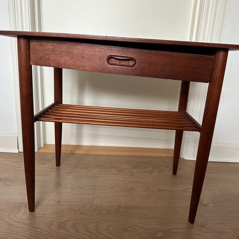 i træ i brun nuance. Bordet har rektangulær bordplade med afrundede hjørner og enkel, åben rammefod. Egnet som sidebord ved sofa, lænestol eller som lille afsætningsbord i stue eller entré.