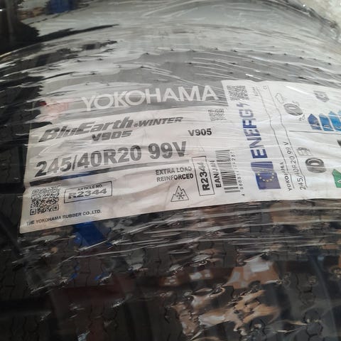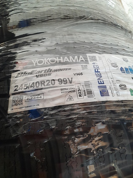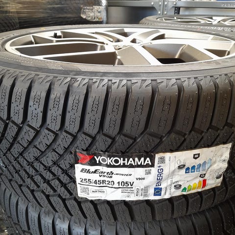 Det her sæt er i 19" med spritnye Yokohama vinterdæk på originale spritnye Hyundai fælge til en Hyundai Ioniq 5 med originale TPMS-ventiler