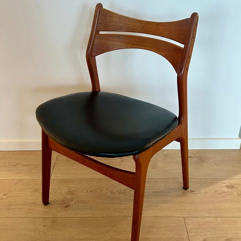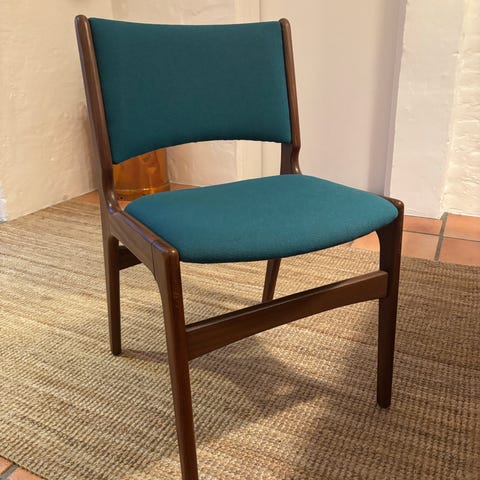 Et sæt at 4 styk Erik Buck spisestuestole med stel af teak. Model OD 49. Er blevet renset og givet olie og er klar til polstring. Et rygstykke skal repareres ved skruehullet (se sidste foto). Sælges kun samlet.