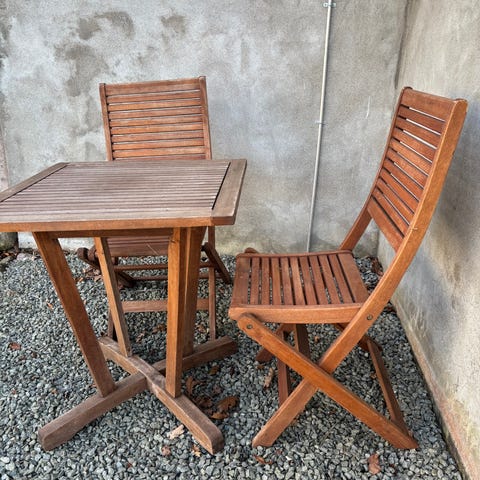 Rigtig fint havemøbelsæt i hårdt træ, bestående af bord, bænk og stole. Selve møblerne er i fin stand, men overfladen trænger til en kærlig hånd. Gives derfor væk for 2 kasser sodavand.