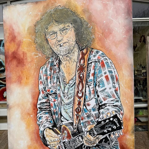 Maleri af Søren C Artboogie. , portræt af ældre person med stråhat og cigaret. Motivet er udført i en tegneserieinspireret stil med kraftige konturer og stærke farver i baggrunden i gule, orange og røde nuancer. Nederst i motivet står teksten "Værsgo" omgivet af stjerner. Velegnet som vægdekoration i f.eks. stue, kontor eller hobbyrum. Maleriet måler 80cm x 100cm.