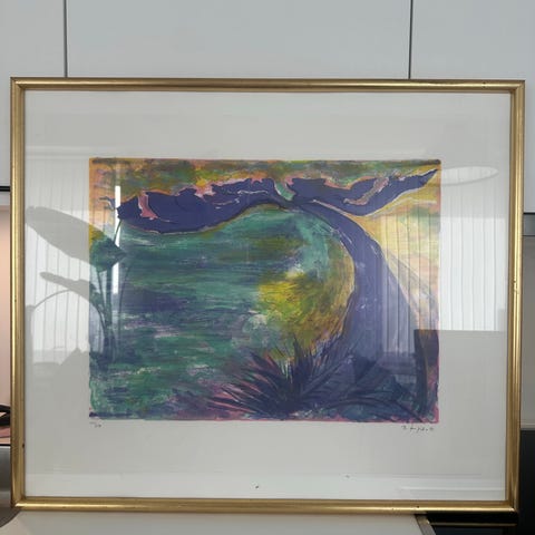 Stort og farverigt litografi i varme røde, grønne og gule nuancer med motiv af blomst. Meget dekorativt værk med stærke farver, der giver liv til rummet. Signeret “B. Lipsøe - 91” og nummereret 122/130, hvilket gør det til en del af et begrænset oplag.