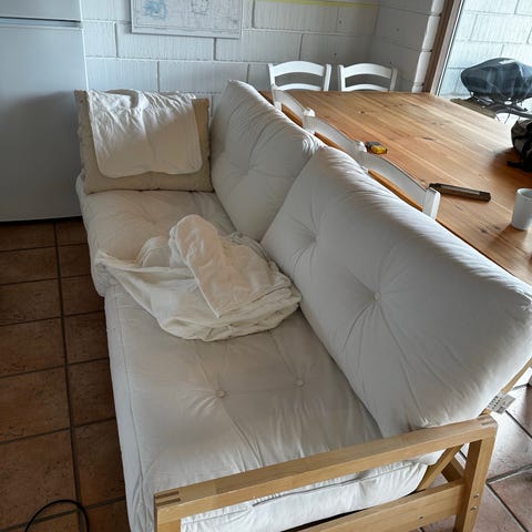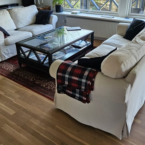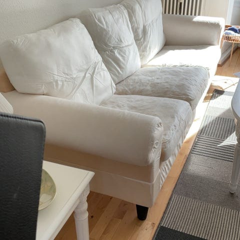 Et år gammelt betræk på 2 og 3 personers sofaerne men trænger til en vask. Stolens betræk er hvid og plettet.