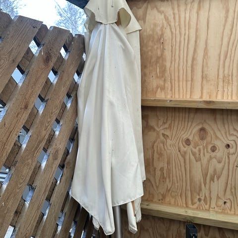 Parasol i beige stof med stang i lyst materiale. Leveres med kraftig fod som giver stabilitet på terrasse eller altan. Parasoldugen kan trækkes op og ned med snoretræk. Velegnet til brug ved havebord eller loungemøbler på udendørsarealer.