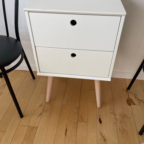 IKEA kommode med to skuffer i lyst træ, Møblet har en glat topplade og to rummelige skuffer med grebsvenlig forkant. Velegnet som natbord ved siden af sengen eller som lille opbevaringsmøbel i stue, kontor eller entré. Overfladen fremstår med træstruktur, og bagsiden er lukket med plade.