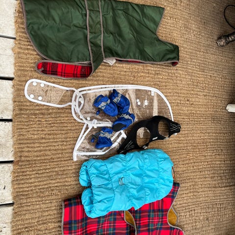 Blandet hundetøj og tilbehør i flere farver og modeller. Der er forskellige typer jakker, trøjer, dragter og halsbånd og liner til hund. Tøjet varierer i tykkelse fra lette trøjer til mere forede jakker samt regnjakke. Noget er brugt mere end andet. Der er desuden en ubrugt transport taske (den brune med ternet foer). Er blevet brugt/købt til en malteser.