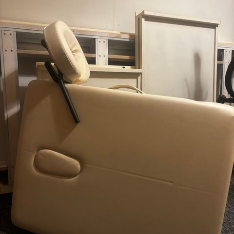 Produktet er en massagebriks med en polstret, grøn farvet overflade. Den har en træstruktur og er sammenklappelig og transportable