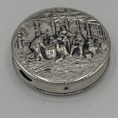 Ældre sølvbelagt repoussé pilleæske. Danmark, start/midt 20.Årh. Klassisk landsby scene i relief. Stemplet: DANMARK. Mål: Ca. 1x5,5x4 cm. Stand: se billeder.