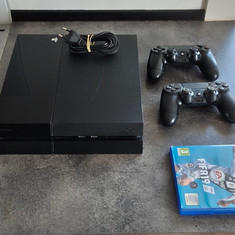Sony Playstation 4 konsol i sort. Konsollen ses på billedet sammen med to trådløse DualShock 4 controllere i sort samt tilhørende kabler. Egnet til spil, streaming og multimediebrug med understøttelse af HDMI-tilslutning til tv eller skærm. Velegnet til både enkelt- og multiplayer-spil i hjemmet.