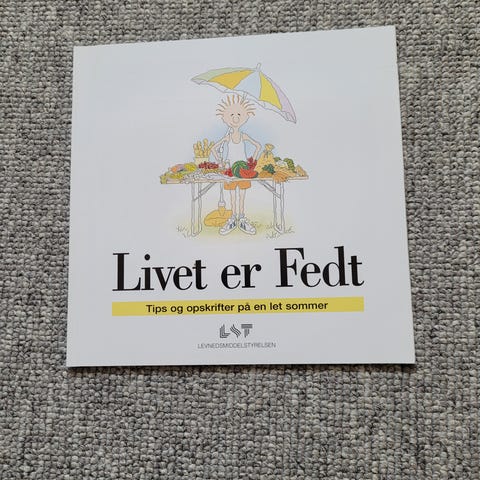 Fødevarestyrelsen "Livet er Fedt" kogebog. Bogen indeholder tips og opskrifter til en let sommer med fokus på mad og måltider. Udgivet af Levnedsmiddelstyrelsen, med illustrationer på forsiden og tekstindhold om lette retter og sommermad.