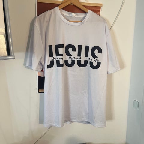 t-shirt til herre i størrelse L. T-shirten er sort og fremstillet i polyester. Foran har den et tryk med et korsmotiv. Klassisk rund hals og korte ærmer. Velegnet til hverdagsbrug eller sport afhængigt af behov.