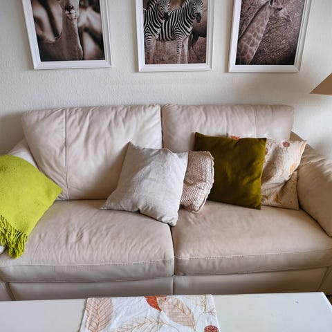 Sælger en hvid lædersofa med chaiselong. Sofaen har været brugt, og der er synlige brugsspor. Meget komfortabel. Mål fremgår af billederne.