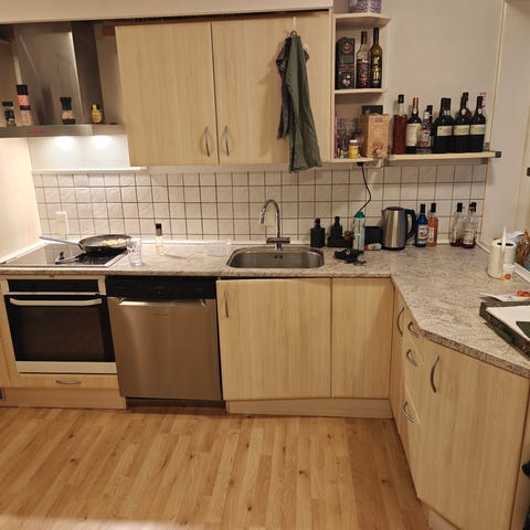 Hjørneskab og vaskskab er skilt ad og har været tilskåret i bundplade og bageplade til rør. Det kan samles hvis man lige har hænderne skruet ordentligt sammen. Men man skal nok købe nogle beslag/lægter.