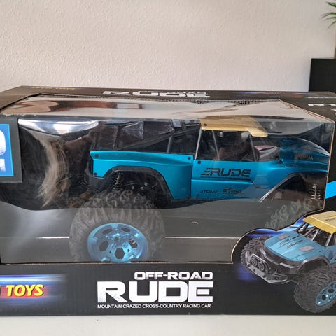 Fjernstyret bil offroad chassis med motor og batteri. Bilen har grovmønstrede dæk egnet til kørsel på ujævnt underlag. Chassiset er i metal med udskæringer for vægtreduktion og køling. Der er monteret elmotor, elektronisk fartregulator og genopladeligt batteri, som er fastgjort i batteribakke midt på chassiset. Velegnet som basis for videre opbygning eller reservedele til fjernstyret bil i offroad-stil.