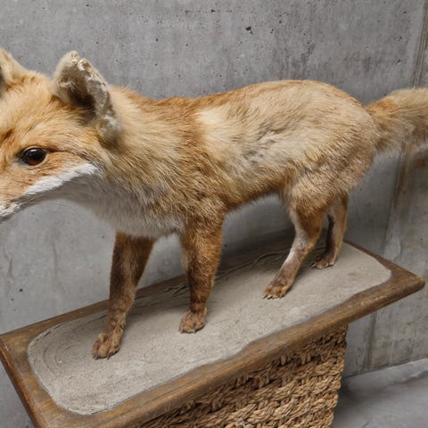 Udstoppet egern monteret på rektangulær træfod. Egernet er placeret på et stykke naturtræ og står oprejst med en grankogle mellem forpoterne. Pelsen er brun med lys underside, og halen er lang og busket. Velegnet som dekorativt natur- eller samlerobjekt til indendørs brug, f.eks. i stue, kontor eller jagt- og naturrelateret indretning.