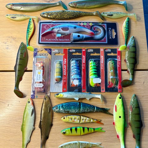 Stor pakke med helt nyt og ubrugt fiskegrej til gedder og aborrer. Pakken indeholder: