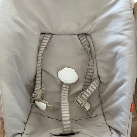 Stokke Tripp Trapp højstol Newborn Set. Newborn-sættet er en indsats til Tripp Trapp højstolen, der gør det muligt at bruge stolen fra nyfødt. Sættet består af en polstret babyindsats med sele og en plastbase, der monteres på højstolen. Farven fremstår lys/beige. Velegnet til spædbørn, så barnet kan sidde hævet ved bordet sammen med resten af familien.