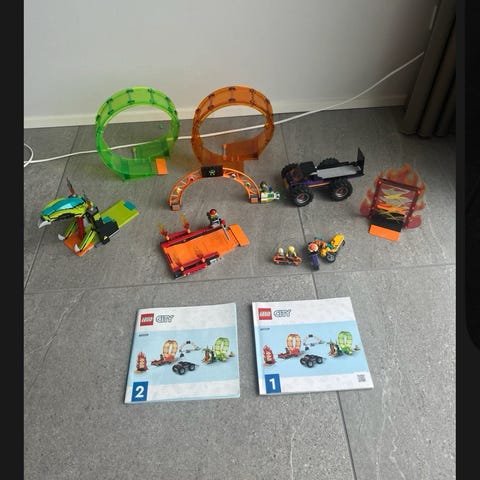 LEGO City legesæt med motorcykel, lille firehjulet køretøj og løs forhindring med flammeelementer. Sættet indeholder to minifigurer med tilbehør samt køretøjer i flere farver. Egnet til leg med action- og byscenarier i LEGO City universet.