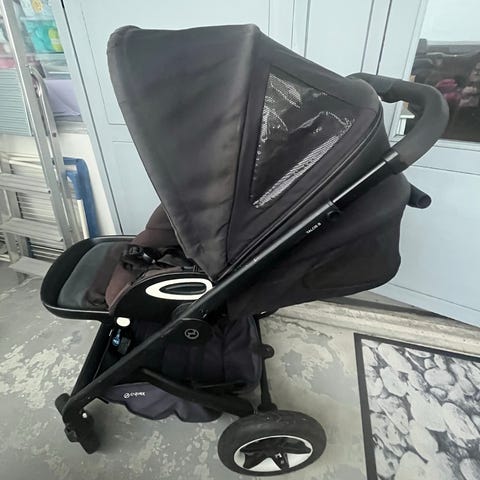 Cybex klapvogn i mørkeblå tekstil med justerbart ryglæn og stor kaleche med ventilationsnet. Vognen har fempunktssele, aftagelig frontbøjle i imiteret læder og indkøbskurv under sædet. Stel i metal med drejelige forhjul og større baghjul, egnet til daglig brug med ét barn.