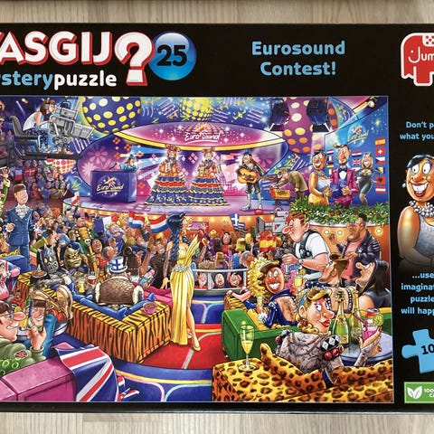 Wasgij Mystery Puzzle 25 Eurosound Contest puslespil med 1000 brikker. Motiv i tegneseriestil med musik- og showtema. Puslespillet er en del af Wasgij-serien, hvor det færdige motiv adskiller sig fra billedet på æsken og kræver, at man løser en visuel gåde undervejs. Velegnet til voksne og større børn, der kan lide udfordrende puslespil.
