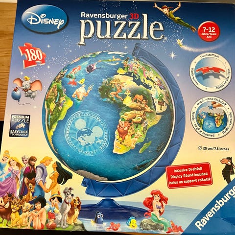 Ravensburger Puzzleball globus puslespil med 180 buede plastbrikker, der samles til en rund globus.