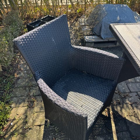 Havebord med 6 stole i sort samt 6 hynder i lysegrå. Bordet har nogle slidmærker og to af stolene er misfarvet af solen - som vidst på billeder.