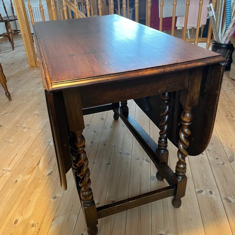 Rundt klapbord/spisebord i mørkt træ. Bordet har oval rund bordplade med to klapper, der kan slåes op og ned efter behov. Understellet består af drejede ben forbundet af tværgående sargstykker, som giver stabilitet. Velegnet som spisebord eller sidebord i mindre rum, hvor der er behov for fleksibel bordplads.