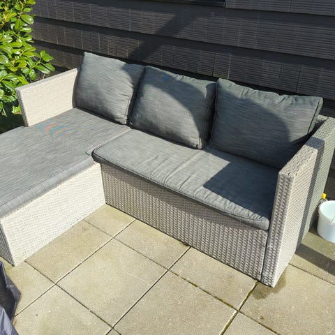 Loungesofa med hynder og chaiselong til 3 personer samt granit/stål bord. Begge købt sidste sommer og er i fin stand.