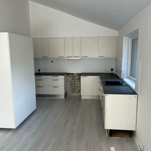Hvidt køkken med skabe, bordplade, vask og hårde hvidevarer