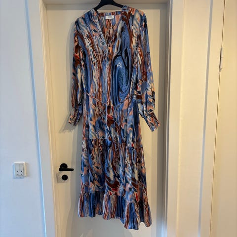 Fin sommerkjole i sart rosa med sort mønster. Brugt 4-5 gange til særlige begivenheder.