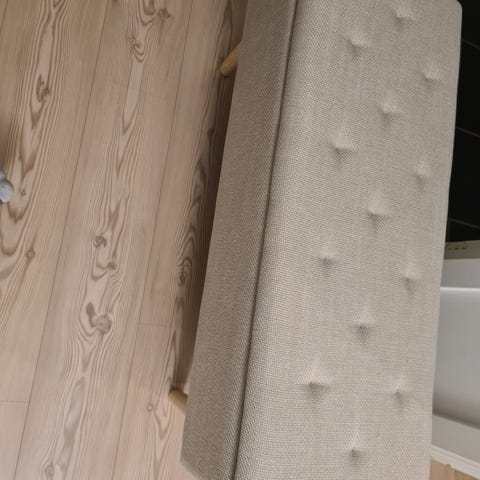 Super fin bænk i træ med opbevaring af hynder. Den er brugt meget få gange og farven er kun blevet slidt af på armlænet fordi den har været dækket af et vandtæt overtræk.