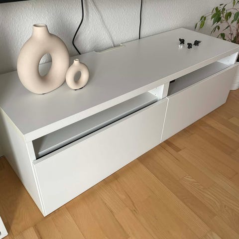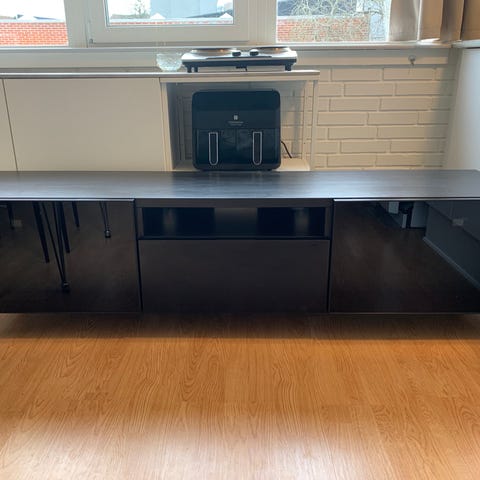 Sortbrun TV-bord, 180x40. Der er en lille skræmme i bunden af en af lågerne. Jeg kan skille bordet af inden afhentning mod forudbetaling.