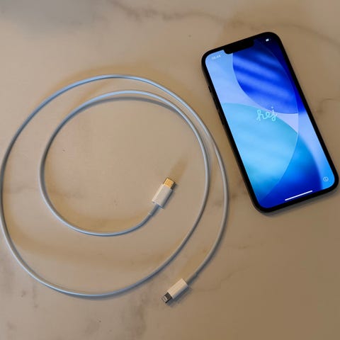 Apple iPhone 14 mobiltelefon med 256 GB intern hukommelse. Telefonen ses på billederne sammen med et cover og en oplader med kabel. Enheden har Lightning-stik til opladning og dataoverførsel. Farve og øvrige specifikationer fremgår af billederne. Velegnet til almindelig brug af apps, opkald, beskeder, internet og lagring af billeder, video og musik.