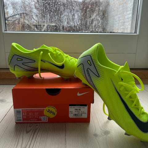 Toplækre Nike støvler, desværre købt et nummer for små så de er kun brugt til én træning og én kamp af en 15 årig. Indersålene har aldrig været i brug, så de er spritnye, de originale Nike snørebånd følger med.