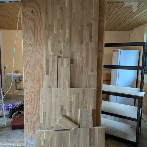 Massiv bordplade i eg i stavlimet udførsel. Lys naturfarvet træ med synlig åretegning. Egnet som bordplade, køkkenbordplade, skrivebord eller arbejdsbord. Glatte kanter og plan overflade, klar til videre behandling efter behov (f.eks. olie eller lak).