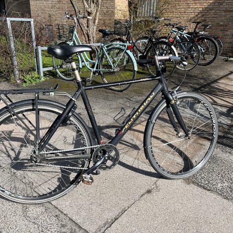 Let herrecykel sælges. Prisen er sat med reparation in mente: det skal trækkes nye gearkabler. Lige nu er den i det høje gear bagpå og den lille klinge foran. Man kan altså godt cykle på den som en single-speed.