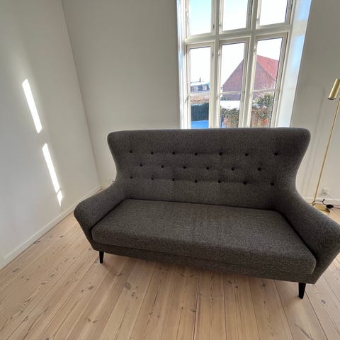 Sofaen er lys grå og fremstår meget velholdt – næsten som ny.