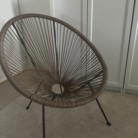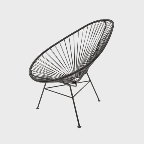 Acapulco stol til udendørs brug i sort. Stolen har rund, skålformet sæde med snore i plast monteret på metalstel. Egnet til altan, terrasse eller have som loungestol. Designet giver let og åben konstruktion, der er nem at flytte rundt på.