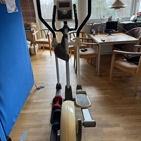 Crosstrainer i grå farve. Modellen har faste og bevægelige håndtag, brede pedaler og display foran til visning af træningsdata (fx tid og hastighed, afhængigt af funktioner). Egnet til konditionstræning i hjemmet, hvor både over- og underkrop kan aktiveres samtidig. Maskinen står på en måtte, som kan reducere støj og beskytte gulvet, hvis den medfølger. Mærket: Tunturi