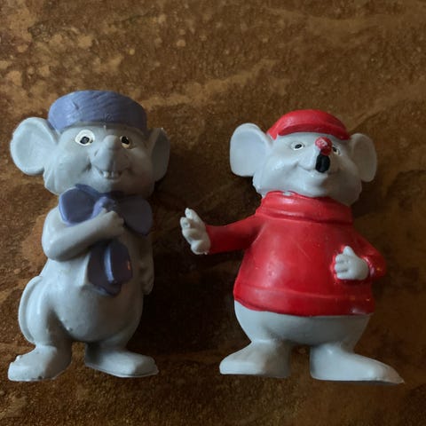 Sæt med 2 små plastikfigurer i hård plast. Disney figurer fra 70’erne. Prins John og sheriffen af Nottingham fra Robin Hood historien. Især sheriffen fremstår pæn men prins Johns kappe er ikke helt hvid længere - se fotos