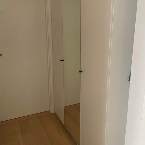 Sælger et moderne IKEA VISTHUS garderobeskab i et stilrent hvidt og gråt design. Perfekt opbevaringsløsning med både bøjlestang, hylder og skuffer.